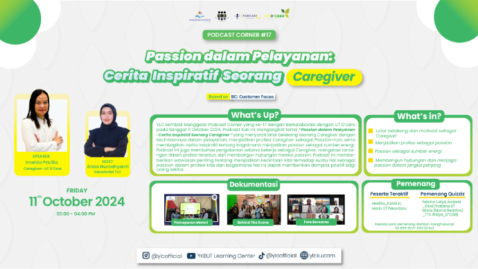 Podcast Corner #17 disampaikan oleh narasumber dari UT D'care , Imelda Pricilia, yang didampingi oleh Anna Nurcahyanti sebagai host. Narasumber dan host memberikan pemaparan yang interaktif dan berbobot, menjadikan suasana podcast tetap menarik dan informatif. Bagi para pendengar yang terdiri dari karyawan entitas YKBUT dan eksternal, topik ini menjadi relevan karena berisi pemahaman mengenai Menjadikan profesi sebagai passion