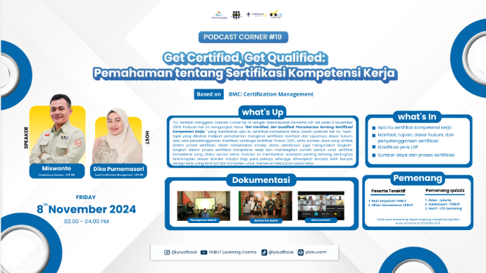 Jumat, 8 November 2024 - Podcast kali ini mengangkat tema "Get Certified, Get Qualified: Pemahaman tentang Sertifikasi Kompetensi Kerja" yang membahas apa itu sertifikasi kompetensi kerja. Dalam podcast kali ini, Topik-topik yang dibahas meliputi pemahaman mengenai sertifikasi, manfaat dan tujuannya, dasar hukum, tata cara penyelenggaraan, klasifikasi Lembaga Sertifikasi Profesi (LSP), serta sumber daya yang terlibat dalam proses sertifikasi. Selain menjelaskan konsep dasar, pembicara juga menguraikan langkah-langkah dalam proses sertifikasi kompetensi kerja dan membagikan contoh bentuk surat sertifikat kompetensi yang diakui secara resmi. Podcast ini memberikan wawasan penting tentang pentingnya keterampilan sesuai standar industri bagi para pekerja, sehingga diharapkan tercipta lebih banyak tenaga kerja yang terampil dan kompeten untuk memenuhi kebutuhan pasar kerja. Podcast Corner diadakan secara hybrid dan memperoleh lebih dari 30 partisipan yang ikut meramaikan podcast ini.