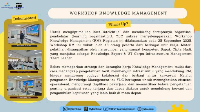 YLC sukses menyelenggarakan Workshop Knowledge Management (KM). Kegiatan ini dilaksanakan pada 25 September 2025. Workshop KM ini diikuti oleh 43 orang peserta dari berbagai unit kerja. Materi pelatihan disampaikan oleh narasumber yang sangat kompeten, Bapak Cipta Hadi, yang menjabat sebagai Knowledge, Expert & UT Corpu Infrastructure Management Team Leader.
