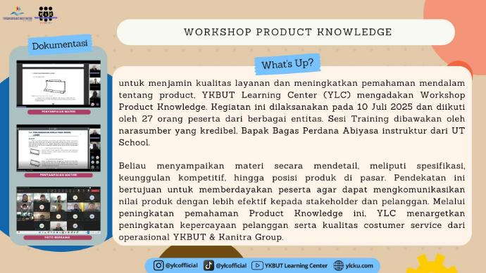 Beliau menyampaikan materi secara mendetail, meliputi spesifikasi, keunggulan kompetitif, hingga posisi produk di pasar. Pendekatan ini bertujuan untuk memberdayakan peserta agar dapat mengkomunikasikan nilai produk dengan lebih efektif kepada stakeholder dan pelanggan. Melalui peningkatan pemahaman Product Knowledge ini, YLC menargetkan peningkatan kepercayaan pelanggan serta kualitas costumer service dari operasional YKBUT & Kanitra Group.