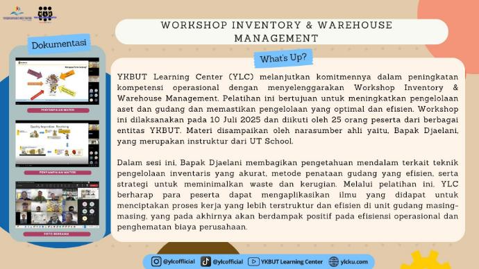 YKBUT Learning Center (YLC) menyelenggarakan Workshop Inventory & Warehouse Management yang bertujuan untuk meningkatkan pengelolaan aset dan gudang dan memastikan pengelolaan yang optimal dan efisien. Workshop ini dilaksanakan pada 10 Juli 2025 dan diikuti oleh 25 orang peserta dari berbagai entitas YKBUT. Materi disampaikan oleh narasumber ahli yaitu, Bapak Djaelani, yang merupakan instruktur dari UT School.
