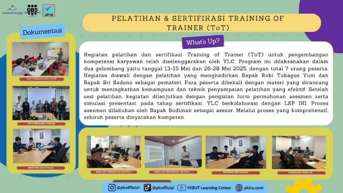 Kegiatan pelatihan dan sertifikasi Training of Trainer (ToT) untuk pengembangan kompetensi karyawan telah diselenggarakan oleh YLC. Program ini dilaksanakan dalam dua gelombang yaitu tanggal 13-15 Mei dan 26-28 Mei 2025, dengan total 7 orang peserta. Kegiatan diawali dengan pelatihan yang menghadirkan Bapak Robi Tubagus Yuni dan Bapak Sri Sadono sebagai pemateri.